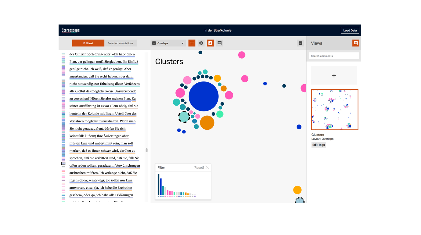 Stereoscope’s interface has three parts. While the left column holds an annotated text, the object of study, the canvas in the centre represents the annotations of the text with different visualization layouts for users to choose from. Annotations in the text on the left and their representations as circles on the canvas in the centre are tightly coupled and change their appearance in both parts when changed in the text or on the canvas. Qualitative attributes of annotations can be altered and recorded by manipulating the visual form.