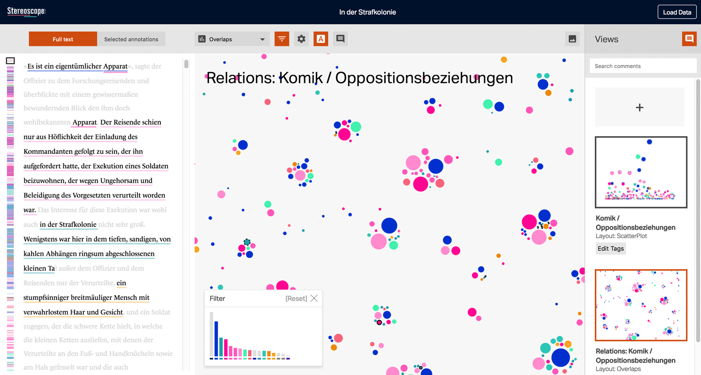 Would you like to try Stereoscope with your own annotation data? Our (freely available) textual analysis platform CATMA enables you to annotate texts and export annotations as a JSON file. Together with the corresponding text file this JSON file can then be imported into Stereoscope. However, since this is an experimental feature, we need to unlock this functionality in CATMA for you personally. Please contact catma-support@catma.de and send us your request to unlock the json export feature.